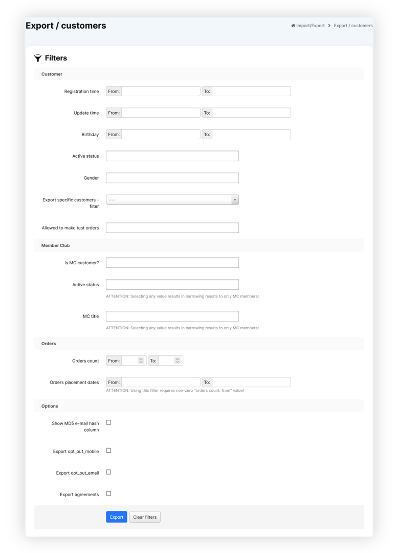 The Export / orders list section allows to further narrow down the list of orders. Below you will find a description of possible actions.