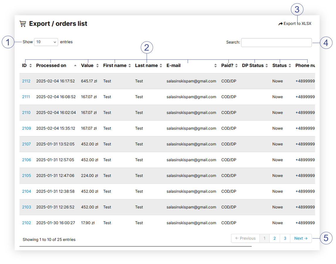- Select the Export to xlsx (3) button to export all filtered orders to the xlsx file. You can learn more about exported xlsx file in the Exporting orders to the xlsx section