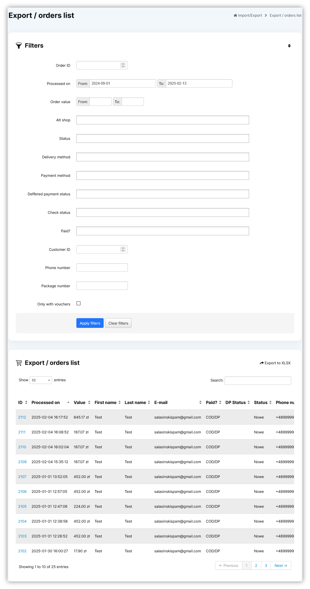 By pressing the Export to xlsx button shown in the Export / orders list section chapter you are able to export all the filtered orders to the xlsx file and download it.