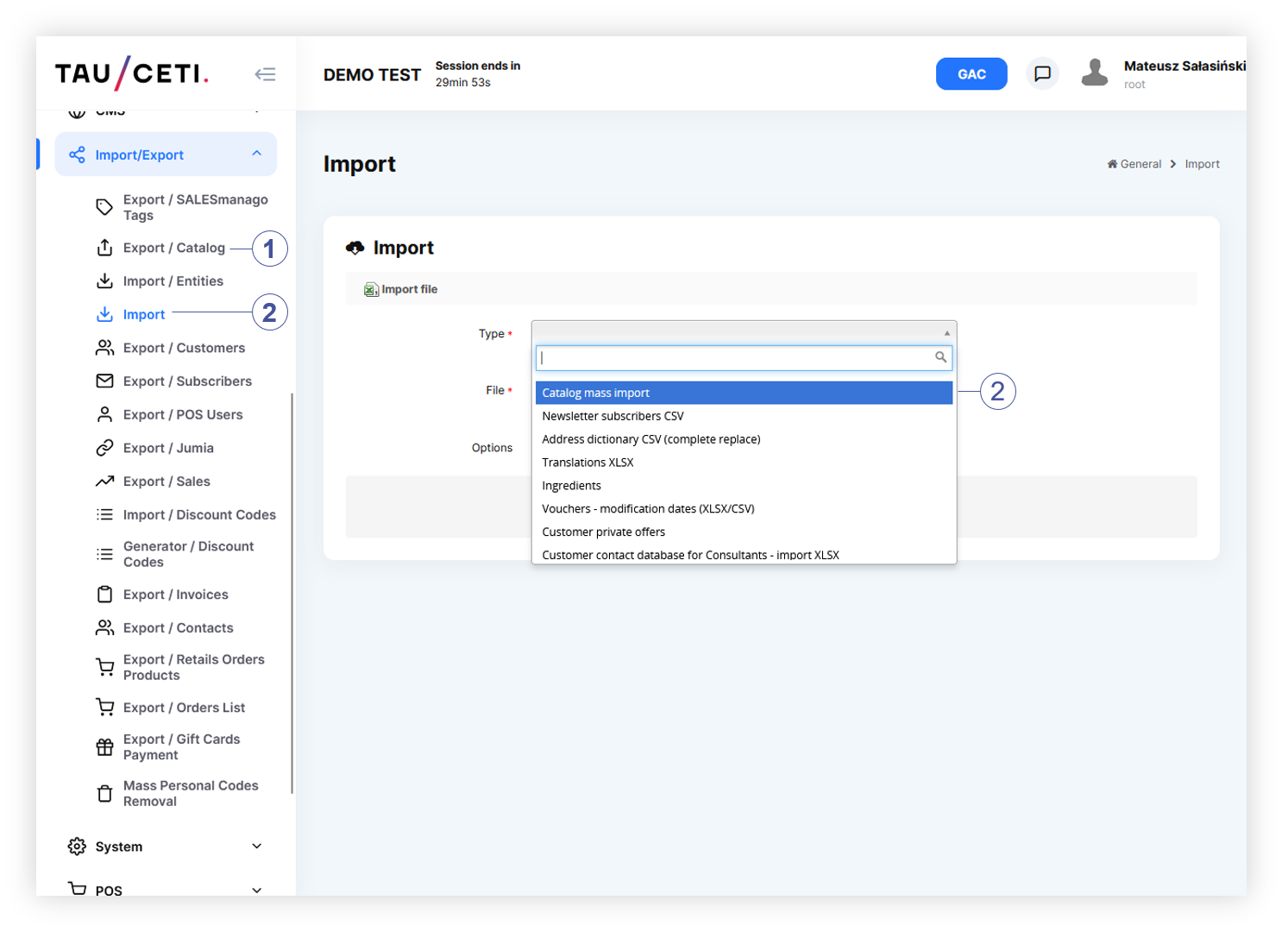 Import can be found in Import / Export > Import > Type > Catalog mass import (2)
