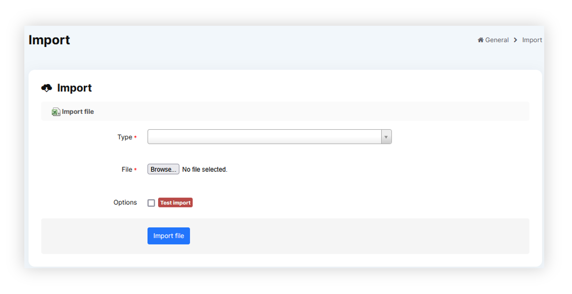 - Import file - Click to perform an import. The file will start processing right after clicking.