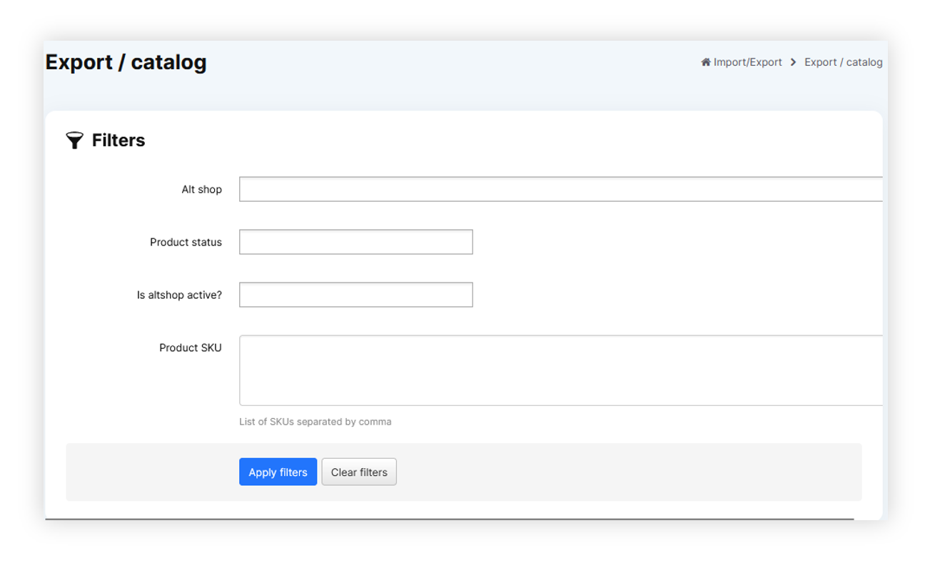 - Alt shop - Chooses for which alt shop the catalog should be exported. If left empty, products from all alt shops will be exported. You can learn more about altshops in the Alt shops - Introduction article.