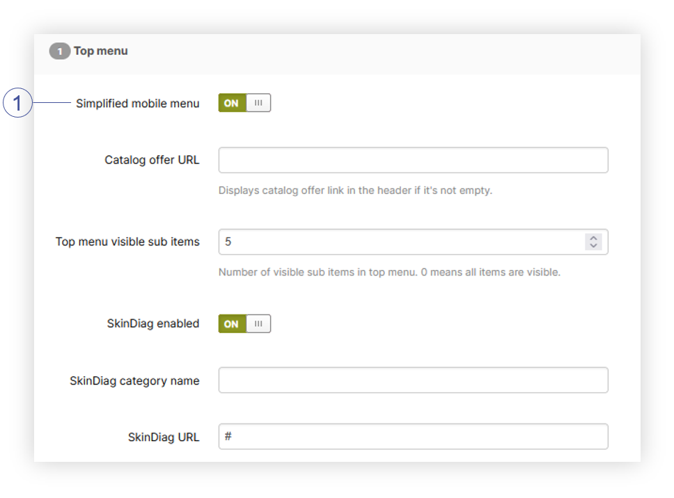 This article describes simplified mobile top menu functionality, that shows top menu categories in the mobile view (1). This functionality allows partners to decide, if they prefer to use top menu for mobile version of the website.