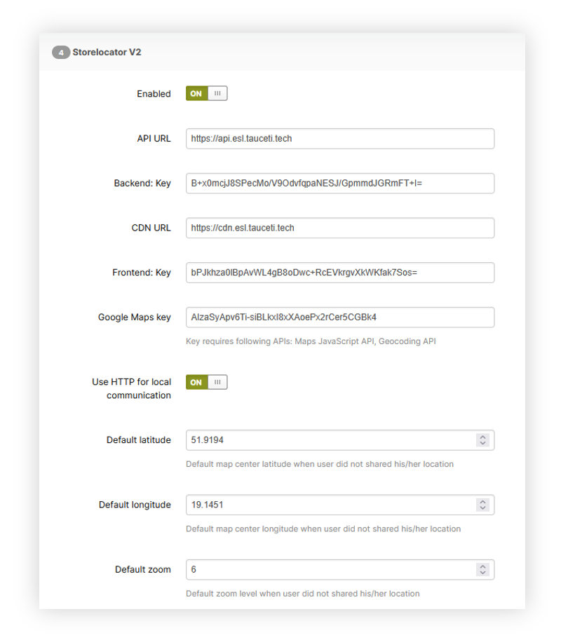 - Enabled - A switch that defines if the functionality is enabled. If this switch is set to OFF customers will get an 404 error when accessing the storelocator URL.